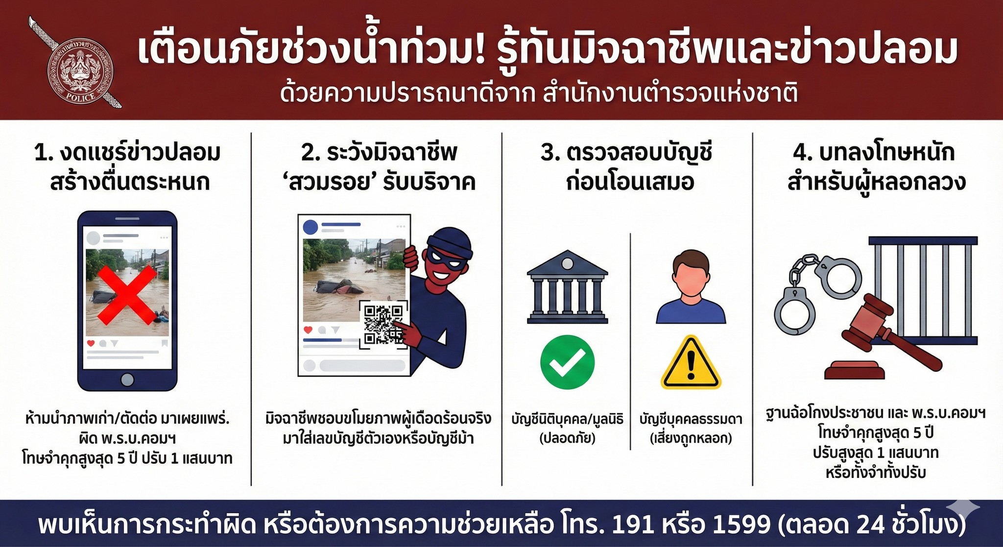 สำนักงานตำรวจแห่งชาติได้ออกประกาศเตือนประชาชนให้ระมัดระวังมิจฉาชีพที่ฉวยโอกาสในช่วงวิกฤตน้ำท่วม โดยก