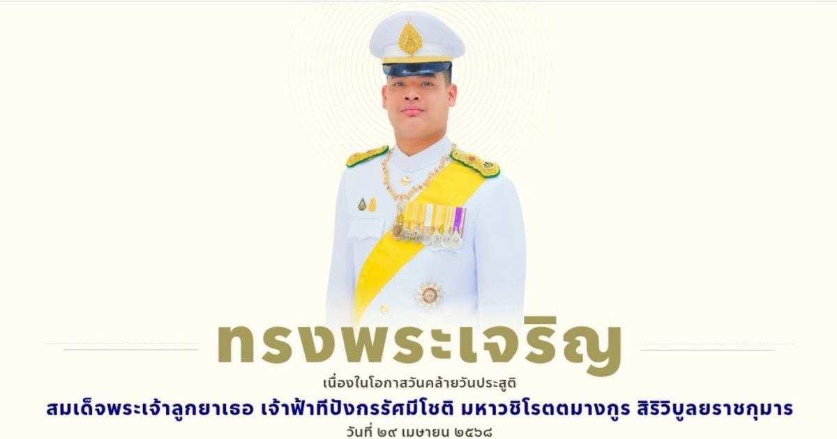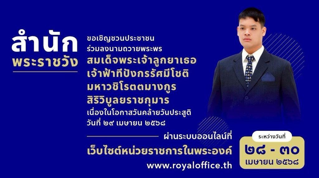 ขอเชิญร่วมลงนามถวายพระพร 28 เมษายน 2568 โดย admpakphanang / ข่าวประชาสัมพันธ์ สำนักพระราชวัง ขอเชิญชวนประชาชนร่วมลงนามถวายพระพร สมเด็จพระเจ้าลูกยาเธอ เจ้าฟ้าทีปังกรรัศมีโชติ มหาวชิโรตตมางกูร สิริวิบูลยราชกุมาร เนื่องในโอกาสวันคล้ายวันประสูติ วันที่ 29 เมษายน 2568 ผ่านระบบออนไลน์ ที่เว็บไซต์หน่วยราชการในพระองค์ wellwishes.royaloffice.th ระหว่างวันที่ 28 – 30 เมษายน 2568