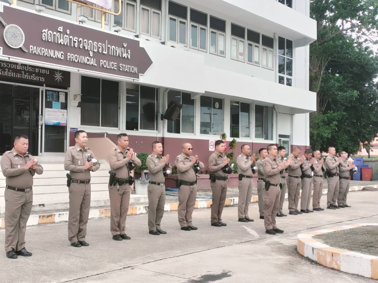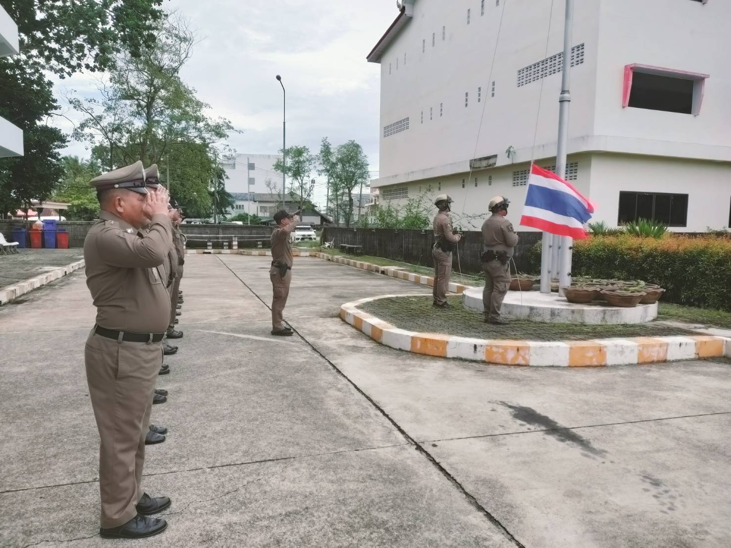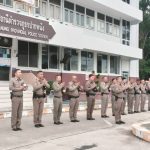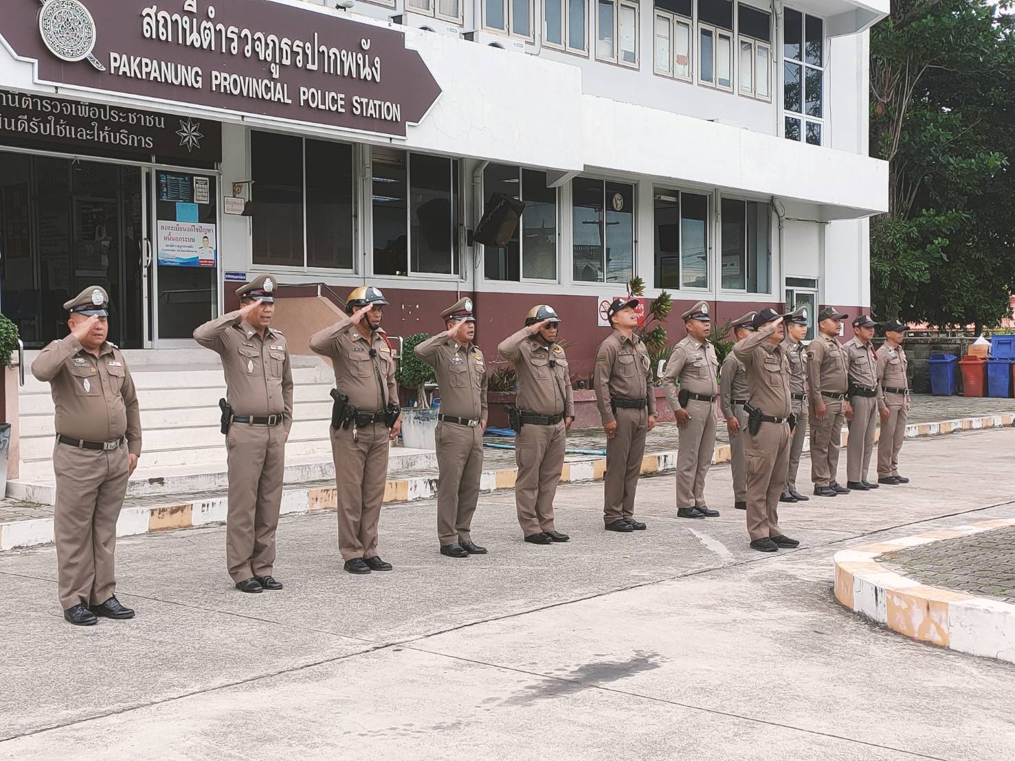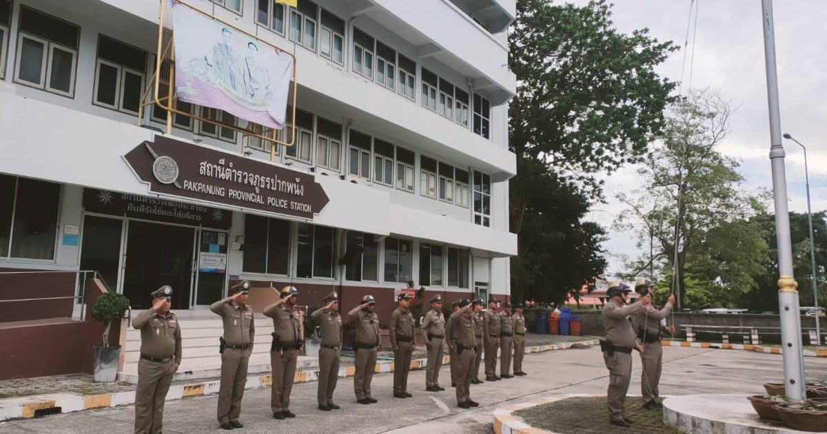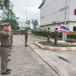 ลงแถวเคารพธงชาติ 23 มิถุนายน 2568 โดย admpakphanang / ผลการปฏิบัติงาน,งานอำนวยการ,ผลการปฏิบัติงาน ข้าราชการตำรวจในสังกัด ทำกิจกรรมลงแถวเคารพธงชาติ สวดมนต์ไหว้พระ กล่าวคำสัตย์ปฏิญาณ อุดมคติตำรวจ ตรวจการแต่งกายและทรงผมตามระเบียบ และรับฟังข้อราชการจากผู้บังคับบัญชา ประจำวันจันทร์ที่ 23 มิ.ย.68 เวลา 08.00 น. ณ บริเวณลานหน้าเสาธง สภ.ปากพนัง